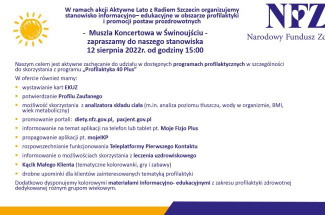 W piątek, 12 sierpnia, od godz. 15:00 na promenadzie, przy Muszli Koncertowej w Świnoujściu, Zachodniopomorski Oddział Narodowego Funduszu Zdrowia będzie miał mobilne stanowisko informacyjno-edukacyjne w obszarze profilaktyki i promocji postaw prozdrowotnych. Wszystko w ramach wydarzenia Aktywne Lato z Radiem Szczecin.