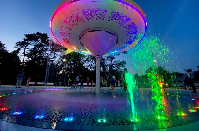 Oficjalnie został uruchomiony wczoraj o godzinie 22.00. Wybór godziny nie był przypadkowy. Zegar jest bowiem cały podświetlony zmieniającymi się kolorowymi światłami, co najlepiej prezentuje się właśnie po zmierzchu. Cały jest też otoczony wodną kurtyną, w której przerwy pomiędzy strumieniami wskazują minuty. Strzałka ze spadającym strumieniem wody – godziny, a małe dysze w posadzce to sekundy.