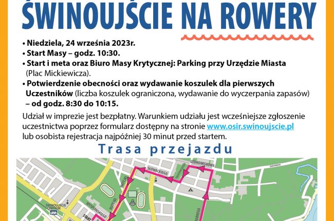 W niedzielę 24 września 2023 r. o godz. 10:30 z Placu Mickiewicza przed Urzędem Miasta po raz 22. wystartuje Masa Krytyczna – Świnoujście na Rowery. Organizatorami wydarzenia są Urząd Miasta Świnoujście i OSiR „Wyspiarz”.